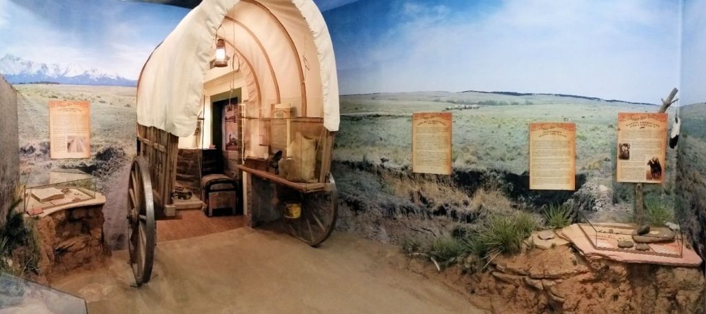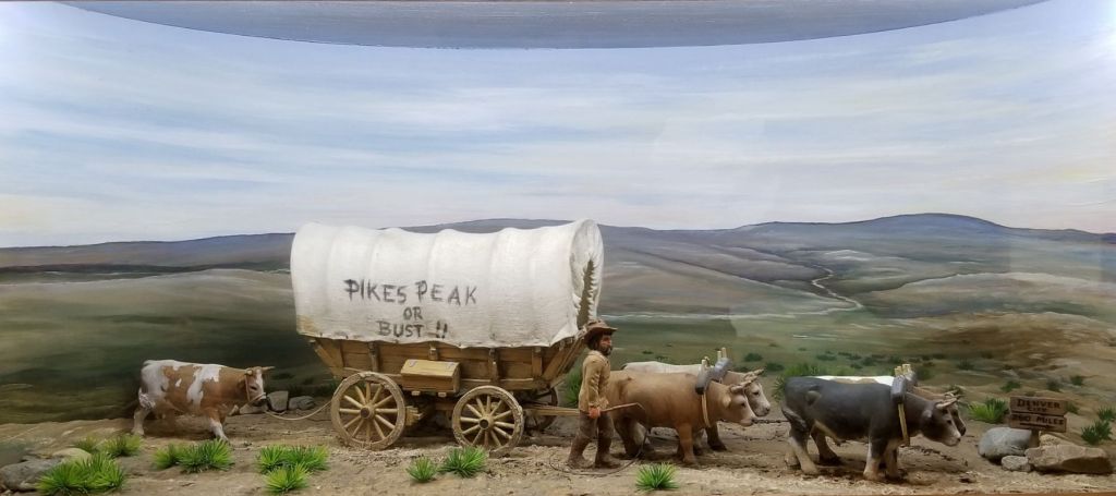 The story of early pioneers crossing the plains to the Rocky Mountain gold fields are depicted in a series of hand carved dioramas by Hank Gentsch. The beautiful and intricately carved panels were originally part of a larger collection that traced the miners’ harsh journey across the eastern plains to the mountains in search of their destiny and subsequent successes; or in many cases, disappointments and defeats. Ultimately, the collection was split into thirds – dividing the mining dioramas between the National Mining Museum in Leadville and the South Park City Museum in Fairplay, and the trail-travel to the gold field dioramas to the Elbert County Museum.